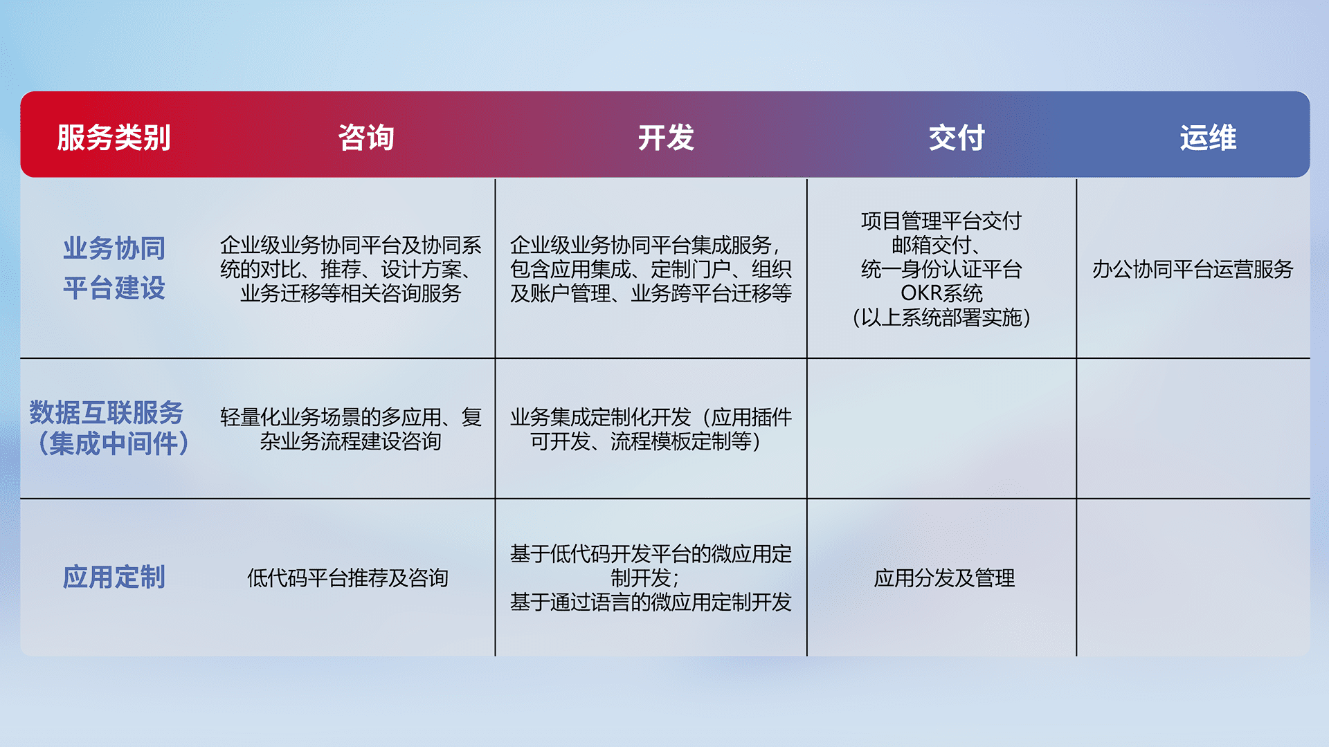 针对钉钉、、、企微、、IDaas等平台级产品提供产品的规划、、、方案、、、、交付、、、定制化开发等服务,,,实现如统一协同办公、、、、智能客户服务、、、混合会议管理、、、智能数据查询、、、、等业务场景,,实现数字化转型。。